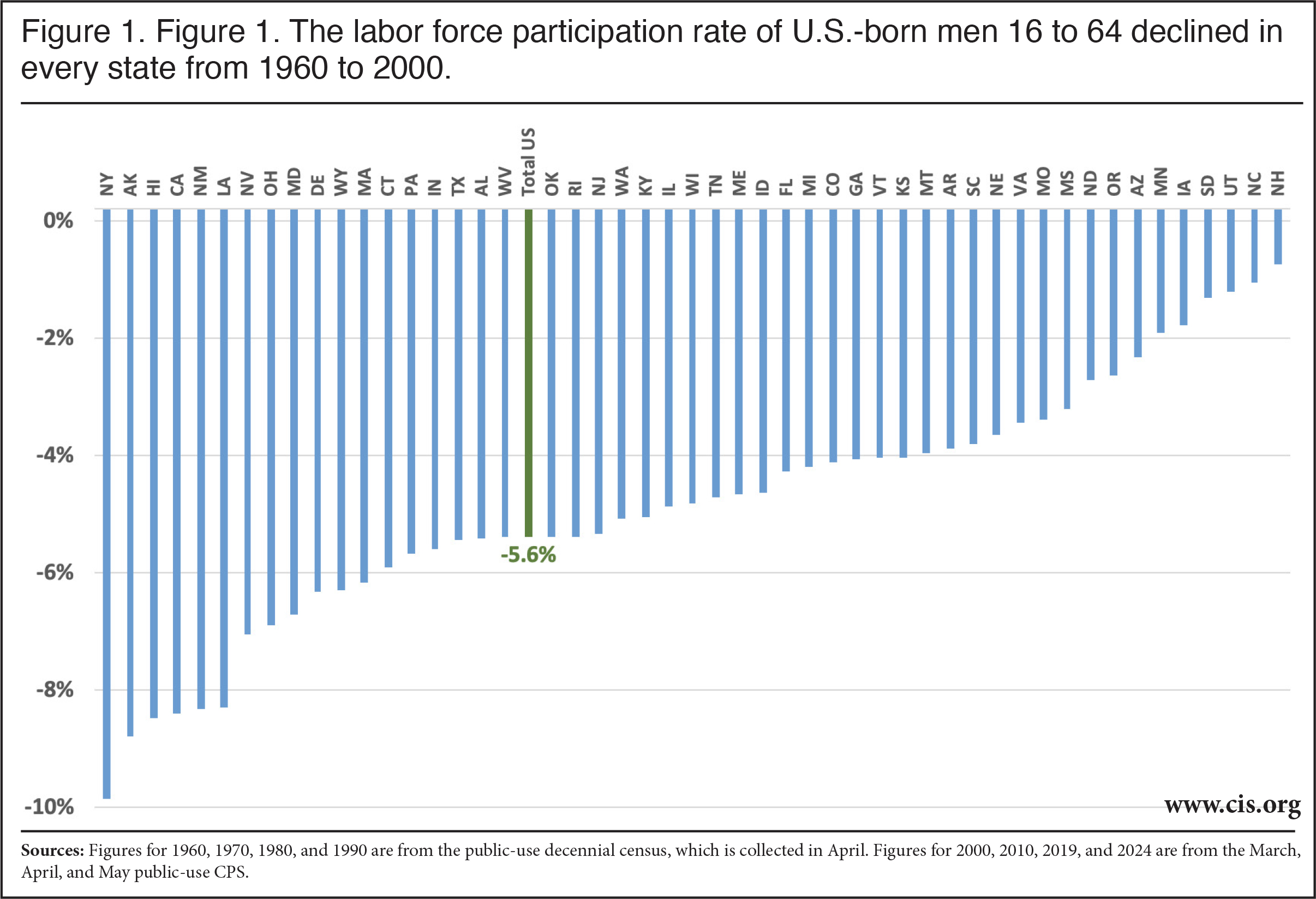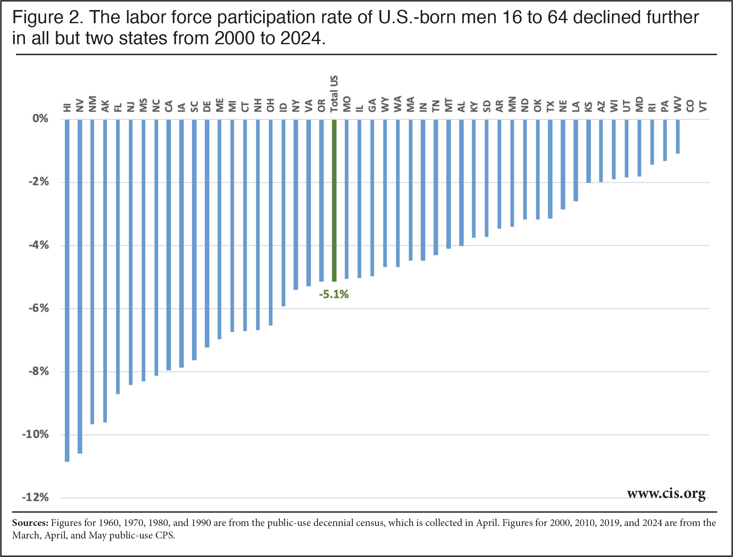 The Data. This analysis is based on public-use decennial census data from 1960 to 1990, along with the March, April, and May Current Population Surveys (CPS) for the peak years of 2000, 2006, 2019, and 2024. The decennial census no longer asks about citizenship and it only provides information every 10 years, so it does not perfectly correspond to peak years of participation between recessions. But it is the only nativity data going back decades. The census is conducted in April, so using a three-month sample with April as the middle month provides robust state-level estimates that match the same time of year as the decennial census. However, it should be noted that for states with small immigrant populations, the sample is still modest in size and should be interpreted in that context, particularly decades ago when there was much less immigration. We exclude those in institutions (primarily prisons and jails) and we focus on men, because unlike women, men have not been heavily impacted by the profound social, cultural, and legal changes that caused an ever-larger share of women to join the labor force, at least through 2000. Men, on the other hand, have experienced a well-documented decline in labor force participation and there is an accompanying body of research showing the harmful effects of the decline. Of course, we also report figures for women.
