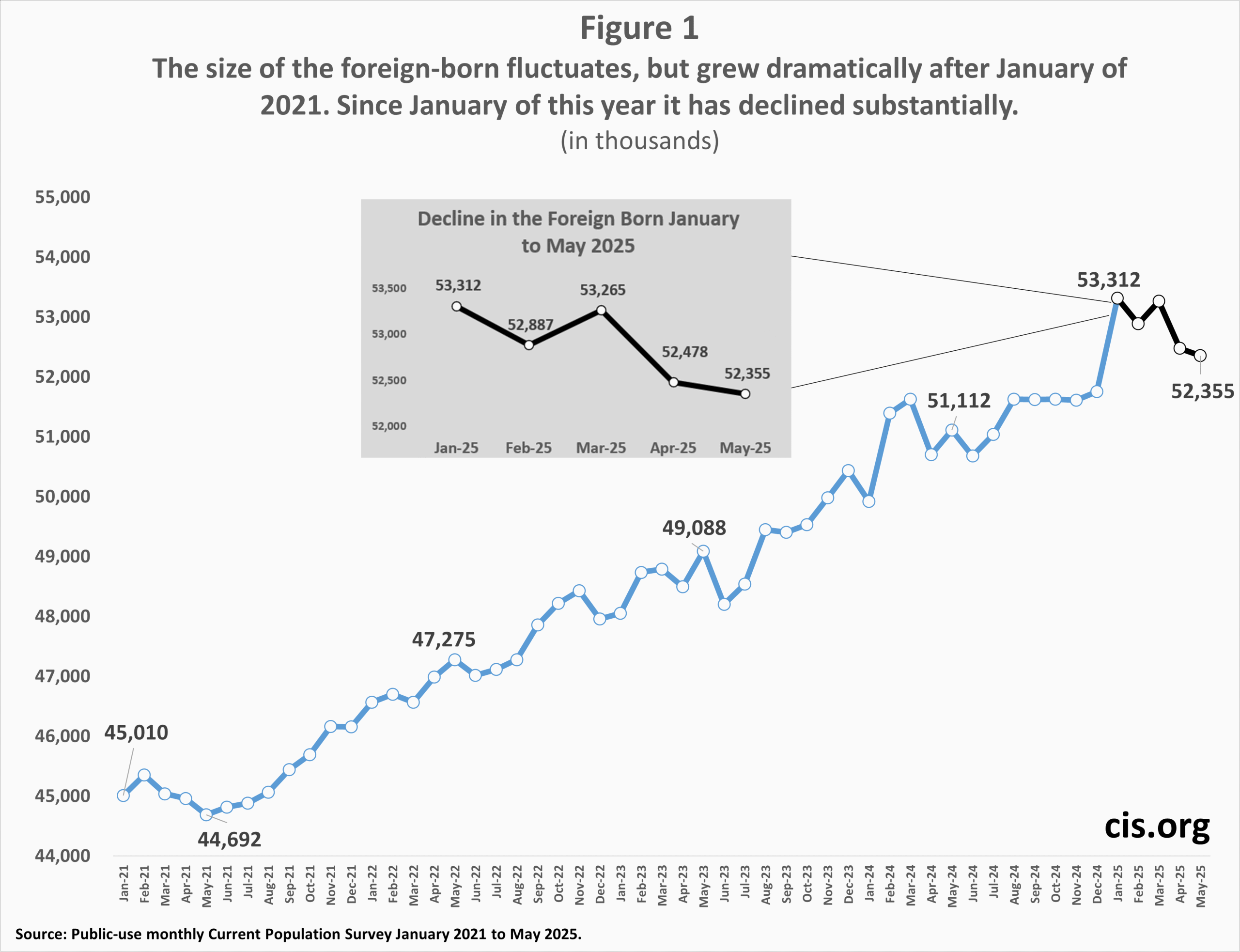 - Our analysis of the raw data shows the total foreign-born population, both in and out of the labor force, declined 957,000 from January to May 2025. This is one of the largest declines over a 4-month period in the foreign-born in the last three decades, but it is not unprecedented.
