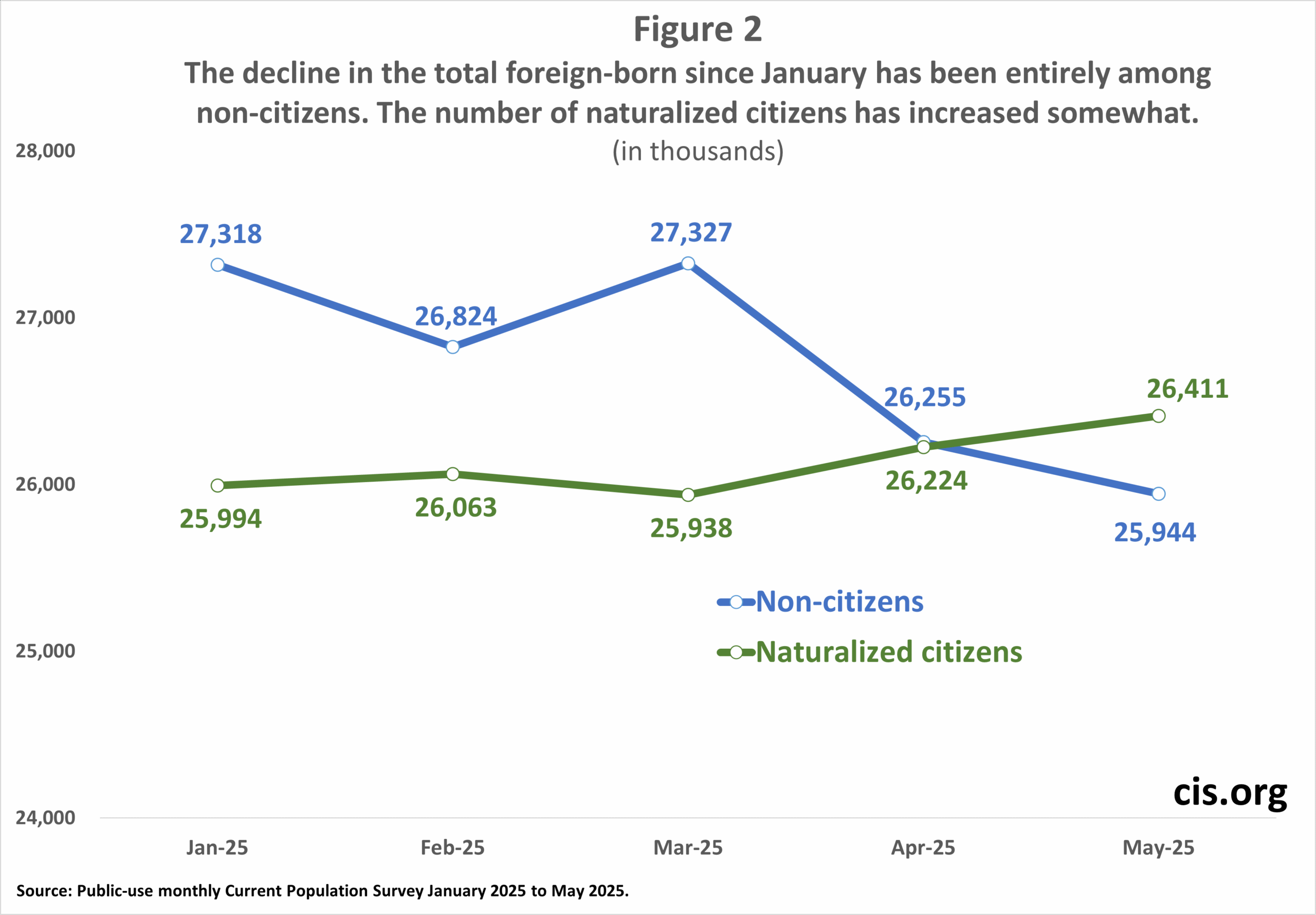 - The decline was entirely among non-citizens. The number of naturalized U.S. citizens in the data did not fall from January to May of this year.