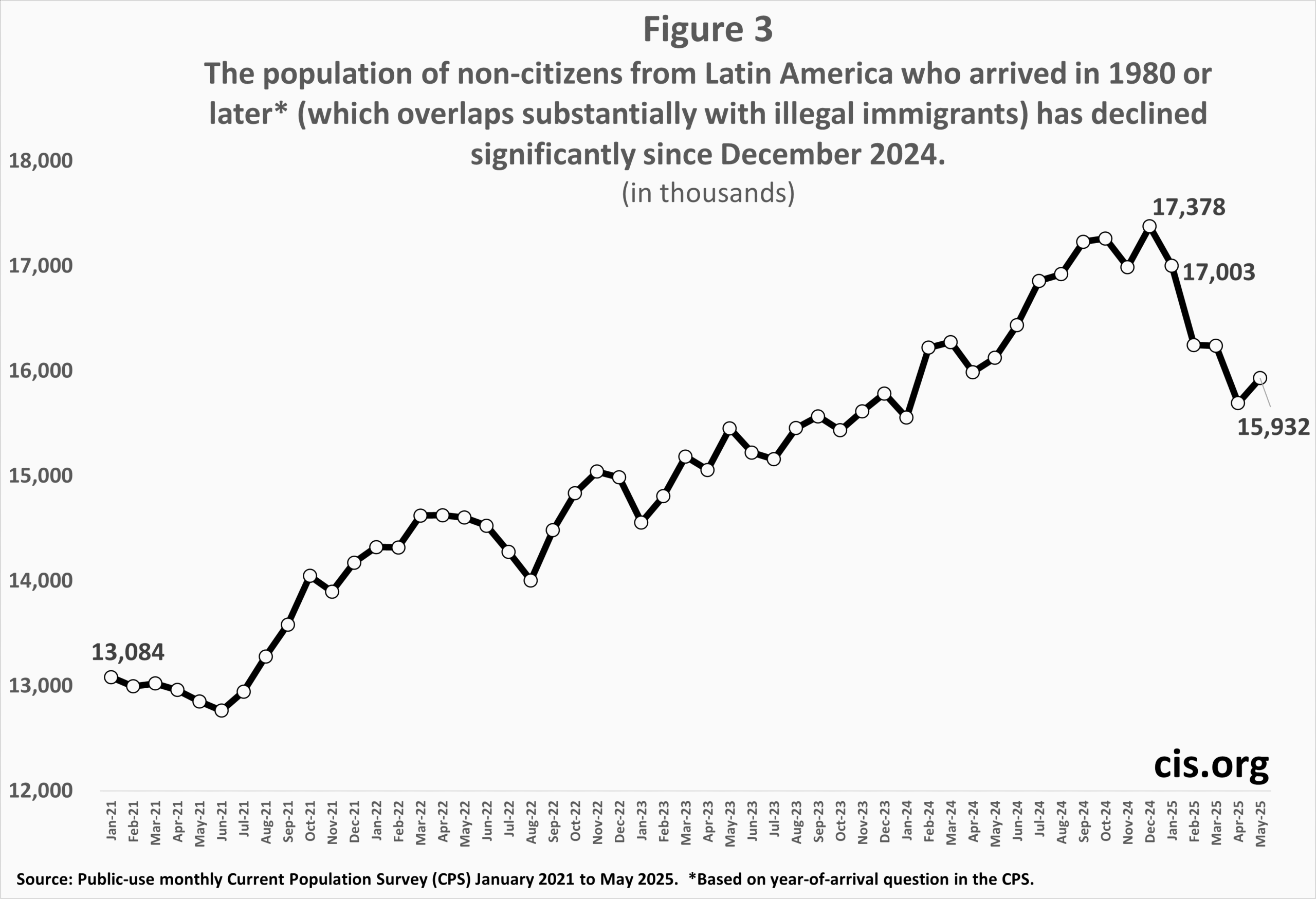 - In particular, non-citizens from Latin America who indicated they arrived in the United States in 1980 or later show a 1.07 million decrease from January to May of this year and a 1.45 million falloff since December 2024.