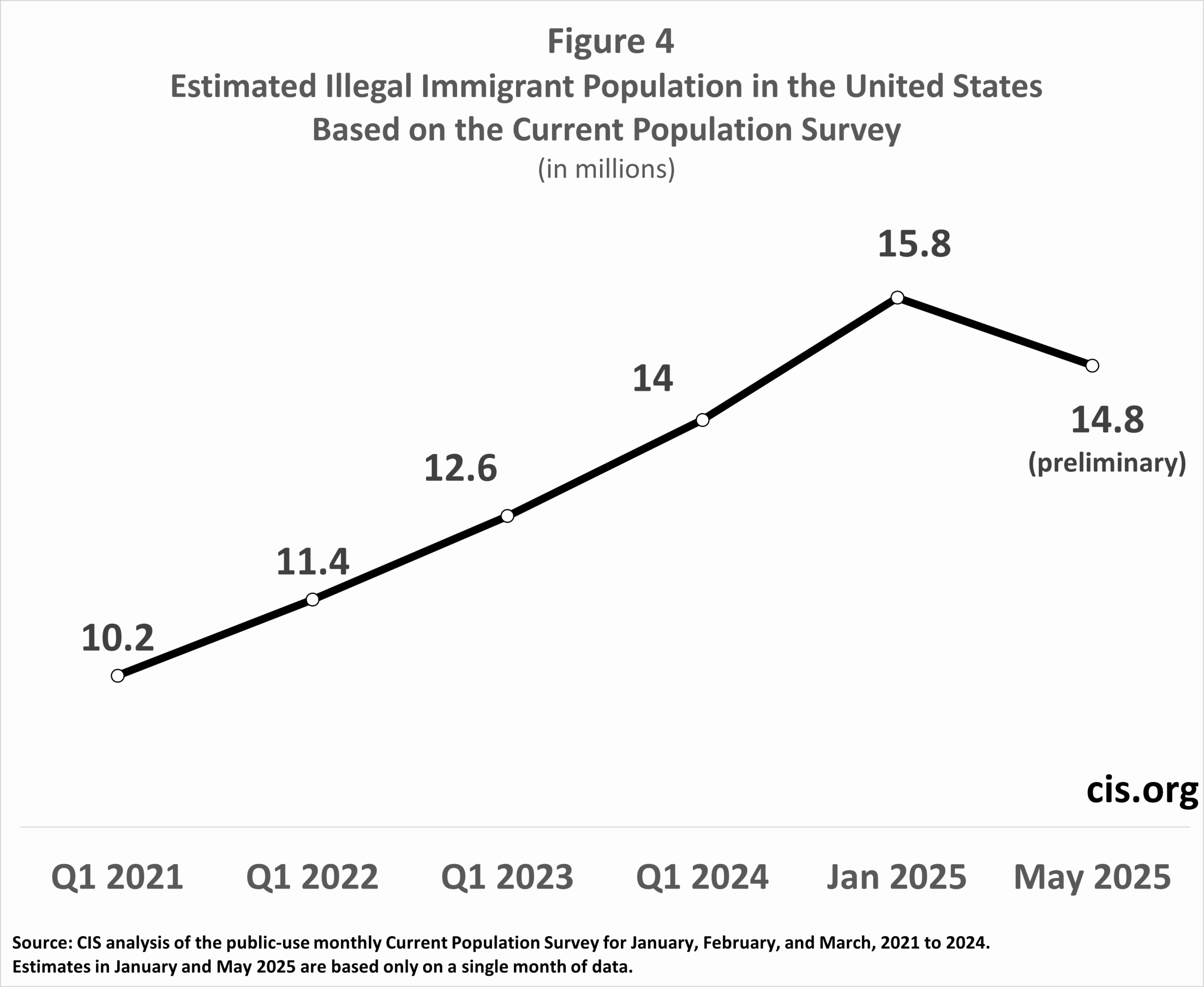- Our preliminary estimate is that there are 14.8 million illegal immigrants in the country in May 2025, one million fewer than we estimated in January of this year.